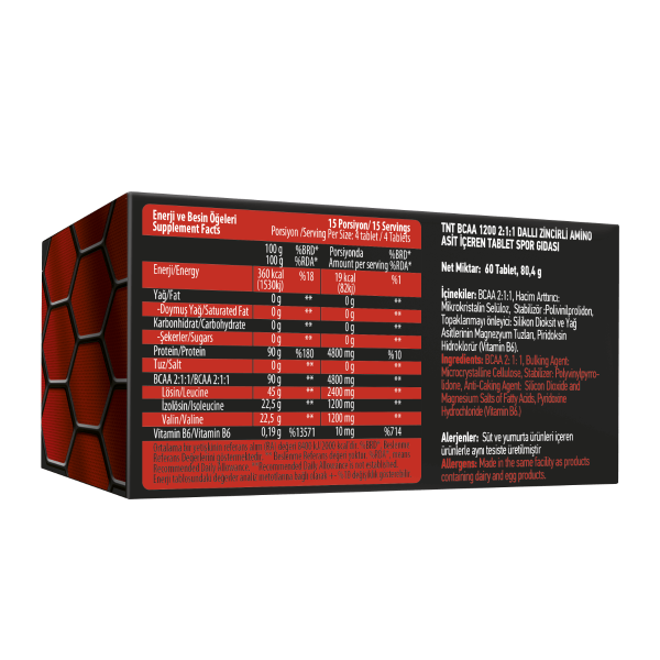 TNT Nutrition tarafından geliştirilen TNT BCAA 1200, tablet formda sunulan ve Lösin (Leucine), İzolösin (Isoleucine) ile Valin (Valine) amino asitlerinden oluşan 2:1:1 oranlı bir BCAA takviyesidir.